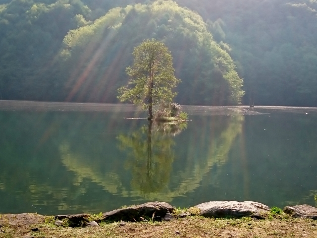 朝夕小ぶりな魚達がにぎやかにライズしてジャレてきています。底には大物が潜んでいてたまにヒットすることがあるので油断しないように。5月なのに雲ひとつない、紺碧の空が広がる様子がレストランの窓に映りこんでいますよ。