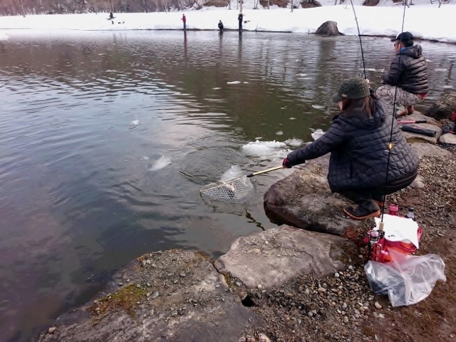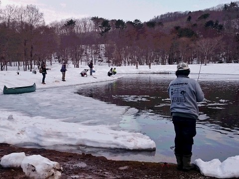 まだ冬模様の裏磐梯、釣果が気になるので、お話を伺ったところ、みなさん30匹〜40匹多い人で1三桁釣れた方もいました。午後から雨になり満足されて早めに帰る方が多くいました。形は小さめから40センチ位が多く釣れたば楽しいとのお話。ポンドの足元は雪が多いので十分気をつけて楽しんで下さい。(金)